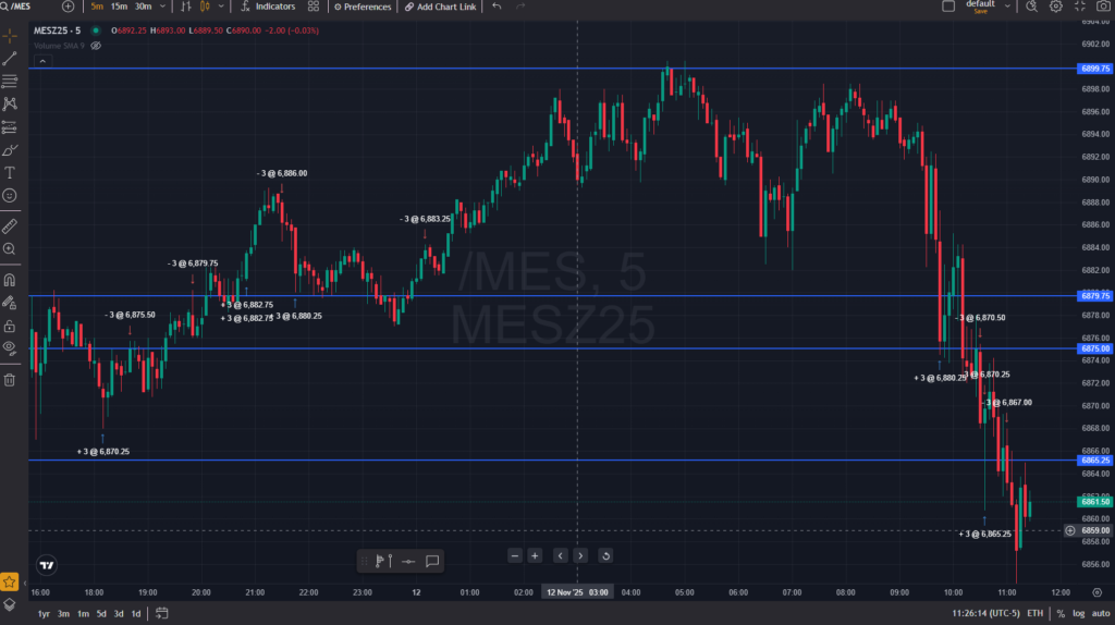 Trade 3 Review (W): Reversed here as it starting to show that it was going to hold above this new support level. Volume came in and sold for quick scalp as you should do with trades like this. I say this because of the lack of volume with it being 6pm session, plus didn’t get the best entry. Def was a bit eager to reverse. I could’ve just took the L/waited for 6880.